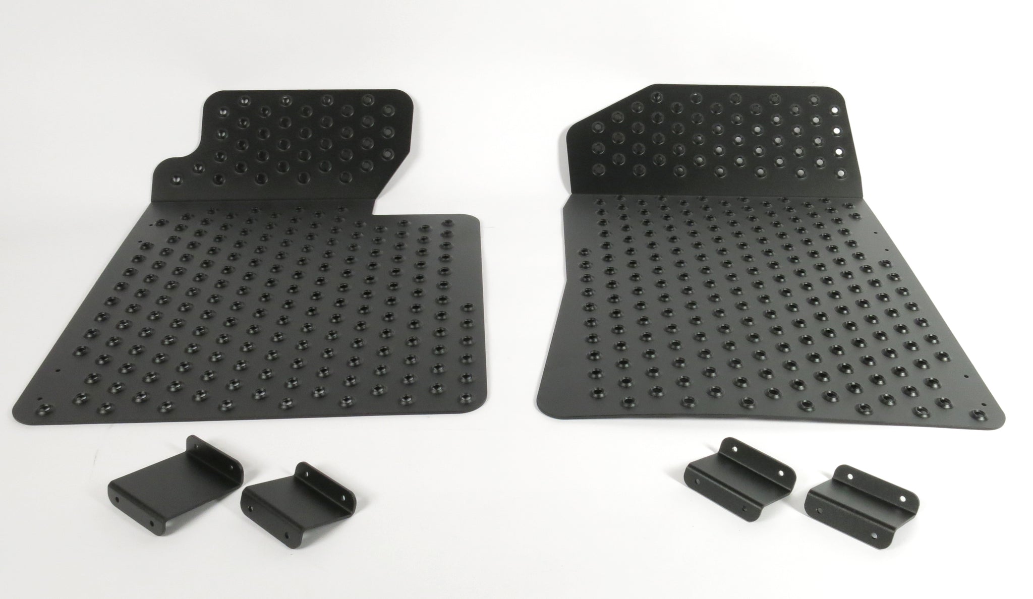 Set of high-quality 3 mm thick black powder-coated aluminum floor plates for BMW E36 models. Provide more comfort and security. They are cut on a CNC machine and have a corrugation for more grip. The set comes with 4 mounting brackets for height adjustment. Quality product from Hamburg.