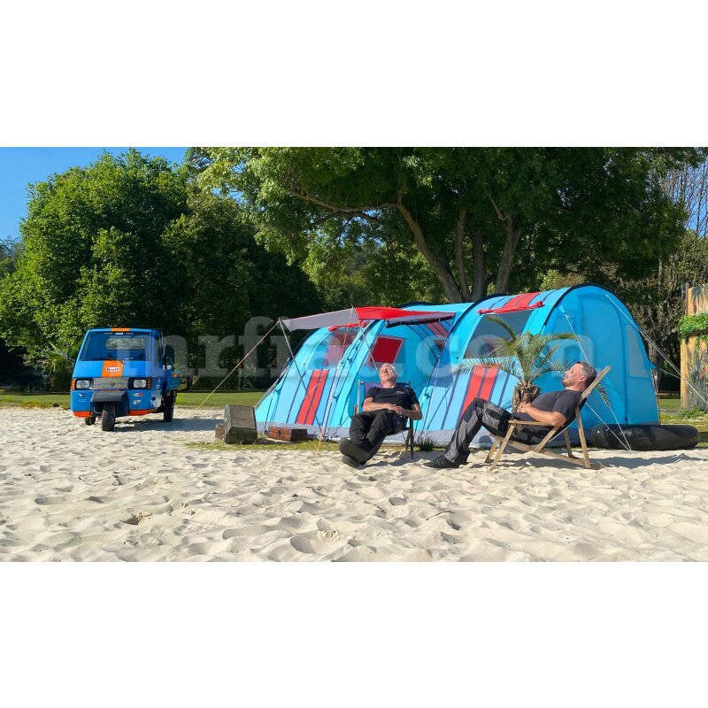 The RAMP CAMP is perfect for fantastic outdoor adventures with friends and family who want to quickly and easily set up their vacation quarters. Not only at the 24-hour race at the Northcliffe, but also on the festival grounds and the campsite, the tent in fresh blue with chic red stripes is a real eye-catcher of a very special kind. The tent offers an area of over 24 m , of which over 13 m can be used as living space even with the sleeping cabin hung up, and that with a comfortable standing height of 210 cm. The permanently sewn-in tent floor offers perfect all-around protection. Included is a spacious sleeping cabin that provides enough space for up to 6 people. For a bit more privacy, it can be easily divided by a roll-up partition and the organizer pockets at the cabin entrance help even the most chaotic roommate to keep things tidy. A big plus in the flexibility of this tent are the three entrances, all of which are equipped with mosquito nets. With the 2 included support poles, one of the two side doors can be turned into a shady canopy - depending on the time of day and the direction of the sun. Two windows with mosquito nets and two foil windows in the living area provide plenty of daylight, so it is pleasantly bright and friendly inside the tent even with the doors closed. All windows can be darkened if needed. Weather-protected permanent ventilation openings in the rear wall of the tent as well as two darken mesh windows in the sleeping cabin area ensure optimal air circulation at all times and contribute to a healthy indoor climate. Practical extras such as the hook for a camping lamp, the weather-protected cable opening, and the matching carrying bag complete the offer. The RAMP CAMP is not only generously sized and top-equipped, but also high-quality, robust, and absolutely waterproof. The shatterproof fiberglass poles ensure a secure stand, even in strong winds. The extremely high water column of 5,000 mm of the PU-coated material of the outer tent and the carefully sealed seams also provide safety and comfort, even in storms and heavy rain.