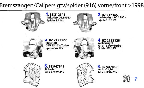 Brake caliper front left for Alfa Romeo GTV/Spider (916) 1.7cc IE 16v models. #1 in corresponding diagram.