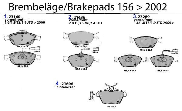 Brake pads with abrasion contact for Alfa Romeo 156 1.6cc/1.8cc/2.0cc models. #2 in corresponding diagram.