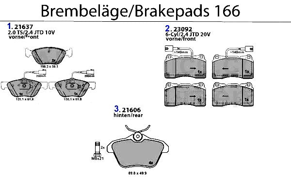 Front brake pads for Alfa Romeo 166 models. #2 in corresponding diagram.