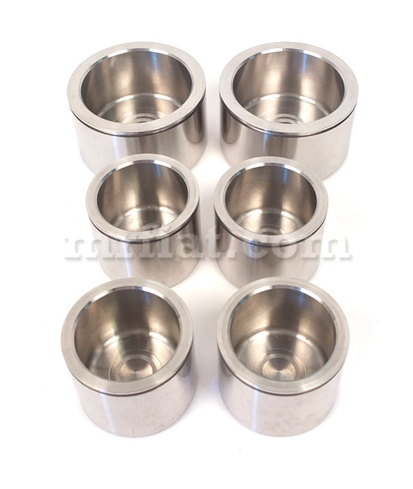 Set of stainless steel front brake pistons for Aston Martin DBS V8 models from 1969-72 and V8 from 1972- 73. It is for 2 front brake calipers. The set comprises: 2 pistons2.375diameter x 1.300long and 4 pistons1.685diameter x 1.300long. These pistons are correct for the 3 piston Girling type 3C front brake caliper. Girling seal kit # SP2577.