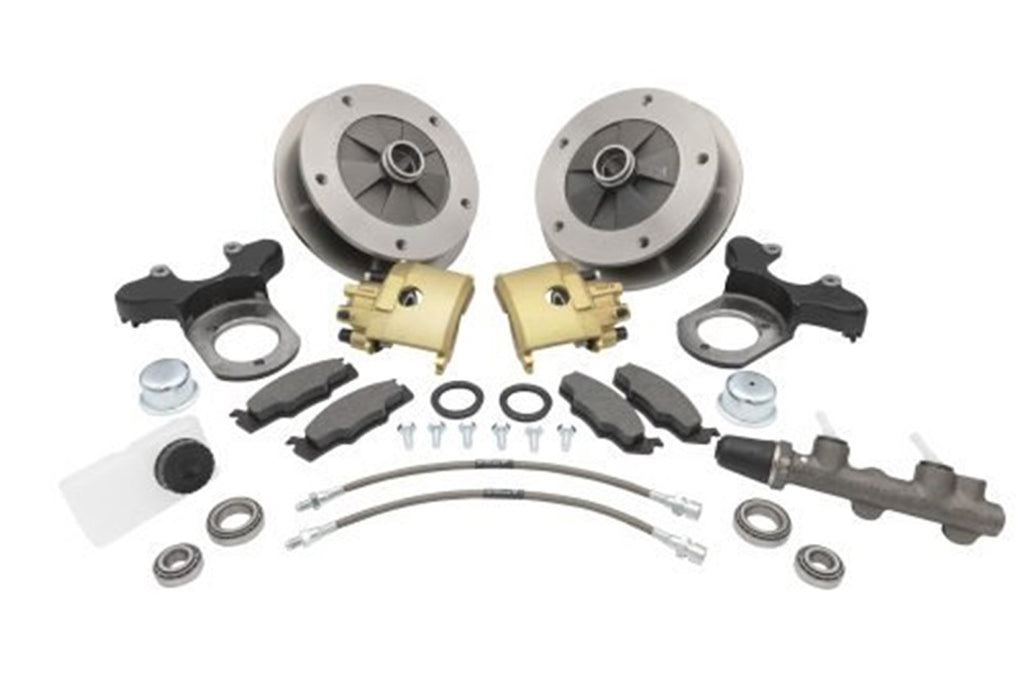 Karmann Ghia models 1967-77 front disc brake set. Comes with caliper mounting bracket, dual master cylinder and reservoir, brake disc, brake pads, stainless steel upgraded brake lines, upgraded SKF wheel bearing and seals and all necessary hardware. You must use with 15'' wheels and will NOT work with drop spindles. Caliper mounting bracket gives you a premium disc brake upgrade while using your existing spindles. With near zero offset and no loss of tire clearance, you can have the stopping power of disc brakes and still bolt on your favorite wide-5 5x205 wheels without using adapters.