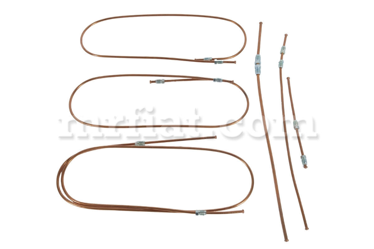 6 piece set of copper brake pipes for Fiat Topolino A,B, and C Berlina models up to Chassis # 261050, and C Belvedere models up to Chassis # 261042. Attachments: M10x1.25 10 and M12x1 2 .