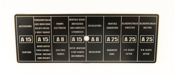 Fuse box sticker plate 8 x b for Ferrari 208 and 308 GT/4 GTB GTS models. It includes 8 fuse box stickers: 15A, 15A, 8A, 15A, 8A, 25A, 25A, 25A on an aluminum plate