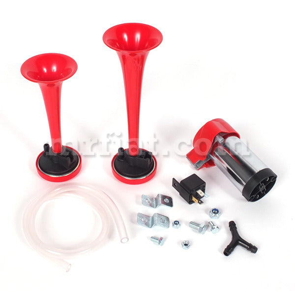 Air horn compressor for Ferrari 206 and 246 GT GTS models. This is a two tone air horn compressor motor and trumpet air horns.