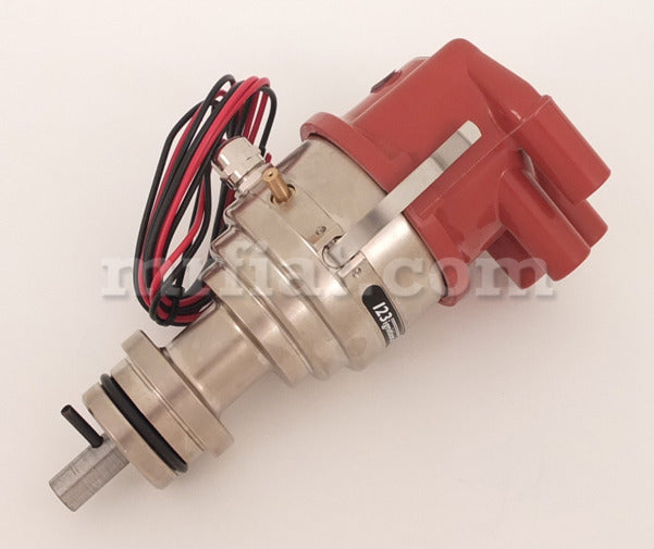 Complete electronic ignition distribtutor for Fiat 124 Spider models with 1800 and 2000 cc engines. It also fits Fiat 131 models. Item # 123FIAT-TC-4-A-V This 123 electronic distributor is designed to replace the mechanical distributormounted on top of the cylinder-headin the popular Fiat twin-cam engines. Four original Fiat-curves are integrated into this productfor Fiat 124 and Fiat 131that can be selected via a little switch in the bottom-face of the distributor-body. Another 12standardadvance-curves can be selected, that offer a nice array of evenly spaced advance-curves, to suit almost ANY requirement. This is a great feature for fine-tuning your engineThe built in curves are for: Fiat 124 Spider sport model 1800: replaces Magneto Marelli S134 BFiat 124 Spider Abarth rally 1800: replaces Magneto Marelli S144 BAFiat 124 Spider 2000: replaces Magneto Marelli SM807 CXFiat 131 Racing 2000: replaces Magneto Marelli AEI 200A, Bosch 0 237 001 002As well as 12 universal curves for tuning and/or driving on alternative fuels like LPG, CNG and bio-ethanolE85. It also offers : vacuum-advance, automatic dwell, spark balancing, automatic power cut after 1 second, gearshift retard, etc... Click here to see the installation manual.The ignition-system in a classic car is often the source of many problems. After many years the mechanical system is worn, and replacement of the points with an optical or magnetical setup, does not make up for wear in the advance-mechanism, the shaft and bearings etc.Well, 123ignition is different. It comes in a housing, that exactly looks like its mechanical counterpart on the outside, but that houses a lot of high-tech on the inside.A 123ignition keeps the looks under the bonnet 'original', but makes the engine spin like a Japanese sewing-machineMoreover : you don't have to sacrifice your mechanical distributor .