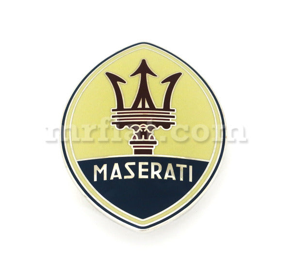 OEM enamel and chrome emblem for Maserati models. The dimensions: 72 x 52.5 mm. Distance between studs: 37 mm. Made in Italy