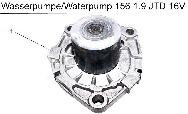 Water pump for Alfa Romeo 156 1.9cc/2.4cc 16v/20v models. #1 in corresponding diagram.