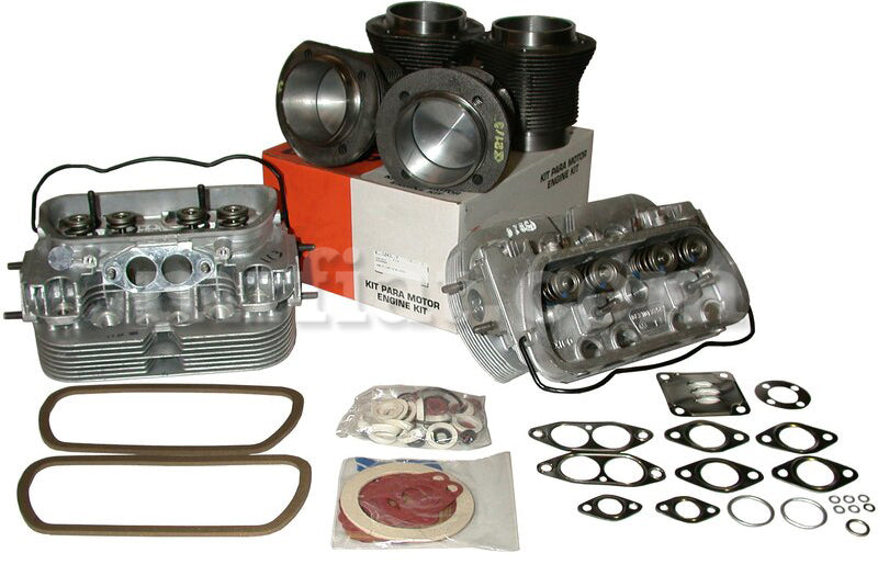 Standard 85.5 mm engine set for Volkswagen Karmann Ghia models from 1970-74. The set consists of 2x new 040 cylinder head dual port complete w/32 mm exhaust- and 35.5 mm intake valves, Mahle 1x piston/cylinder set 85.5 mm, and 1x engine gasket set single/dual port.