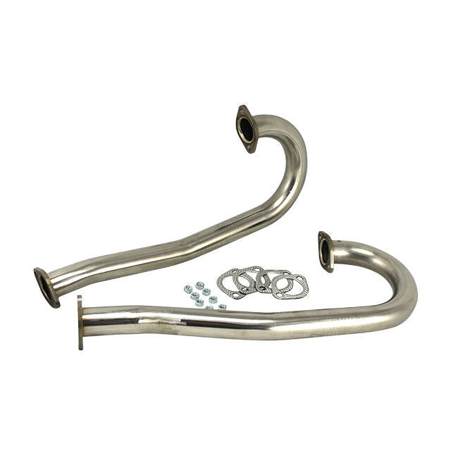 J-Tubes 38mm with flanges, Stainless Steel These J-tubes are an alternative for the already existing metallic J-tubes and they can be used to replace the heat exchangers. We give you the opportunity to compose the exhaust yourselves and therefore we have both systems available. One with standard clips and another model with fixed flanges. The J-tubes are delivered a pair, seals and assembly material included. for Beetle, Bus Brasil, Bus T1, Bus T2A, Bus T2B, Karmann Ghia 14, Type 181 models.