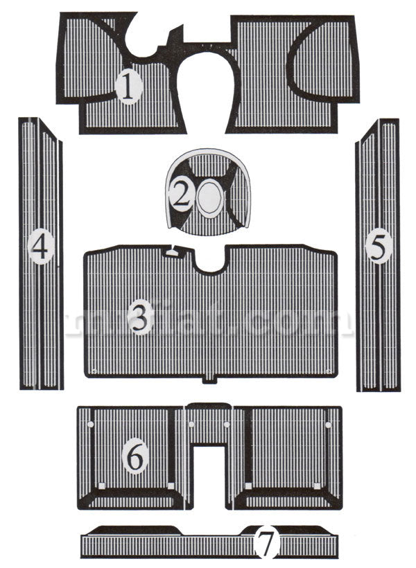 Rubber mat set for Lancia Fulvia Sport Zagato 1st Series. There is a 2-3 week production time for this item. Made in Italy. Original Equipment Manufactured Part. Part number: 13275-000