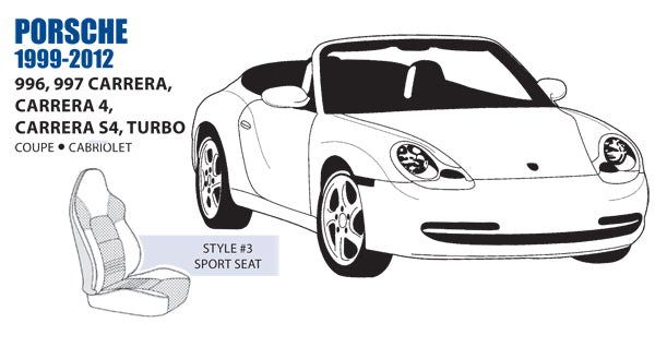 OEM style #3 front leather cover seat set Porsche 996 and 997 Carrera models from 1999-05. 4 piece set that covers cushions and backrests. Concourse quality made to the original specifications by Craftsman pattern maker. Made in USA.