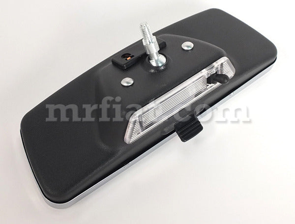 Chrome interior rear view mirror for Alfa Romeo Spider models. Rear view mirror with integral interior light to fit all 105 Series Spiders from 1966-83. Note that this has the 'chrome' mirror surround as used on the original 1600 Duetto Spiders, but can also be fitted on the later cars. Includes the anti-dazzle mechanism and interior light unit. The length is 7 in. The width is 2 1/4 in.
