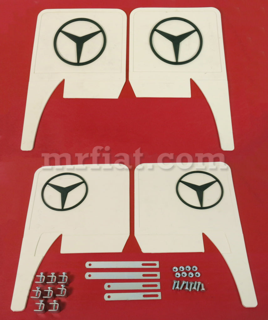 Set of white mudguards for Mercedes W107, W108, W114, W115, W116, and W123 models. Available with or without emblem, please specify when ordering.