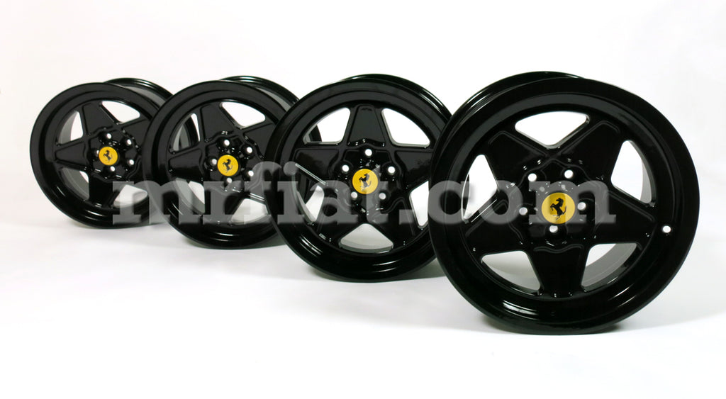 Set of 4 wheels: two front 7x16 and two rear 8x16 black five spoke Ferrari style 16wheels for Ferrari 208 and 308 GT4, GTB and GTS models. Offset: 11 mm, PCD 5X108 Recommended tires: 205/55 x ZR16 Pirelli P6000frontand 225/55 x ZR16 Pirelli P6000rear .