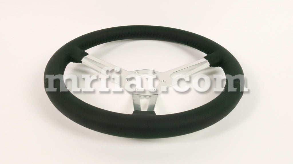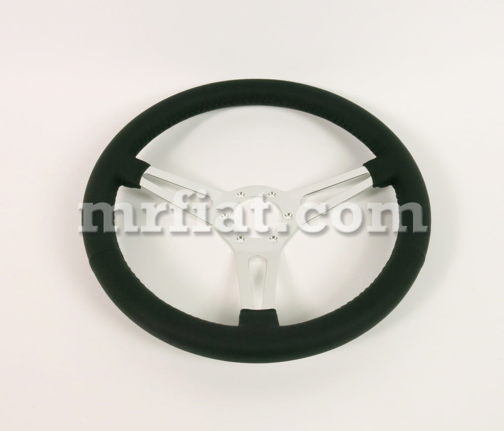 Classic 380 mm dished black leather steering wheel with 3 stainless steel spokes for Alfa Romeo Spider models from 1966-94. Horn button hole: 60 mm. Pitch diameter: 74 mm. This aftermarket Alfa wheel works with Luisi and Nardi hub adaptors.