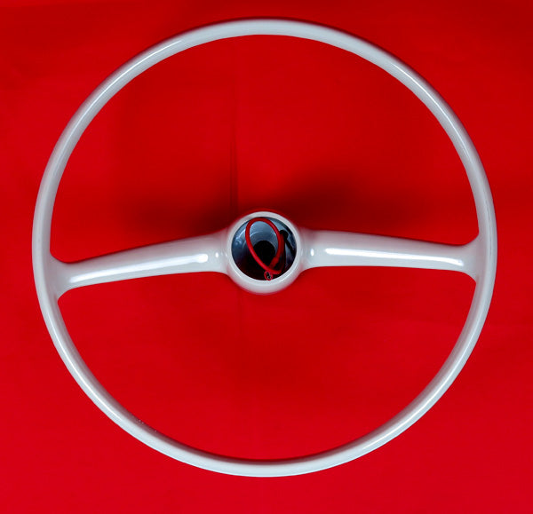 Grey steering wheel and horn button for all Fiat 500 models. Excellent reproduction from Italy. Diameter: 15 inches.