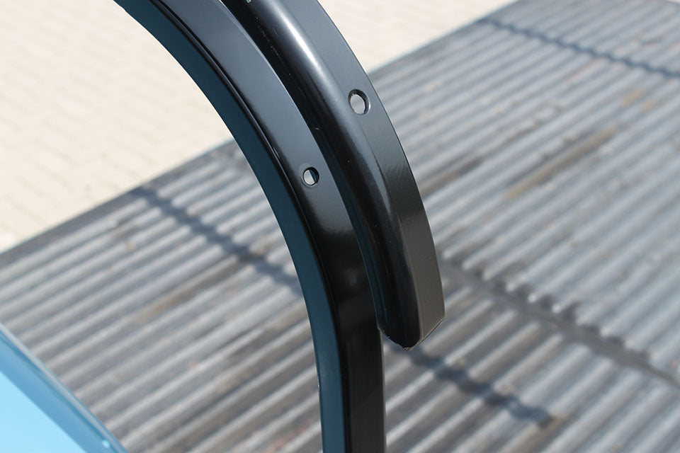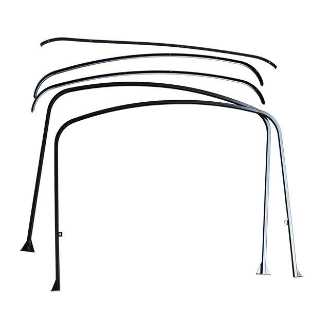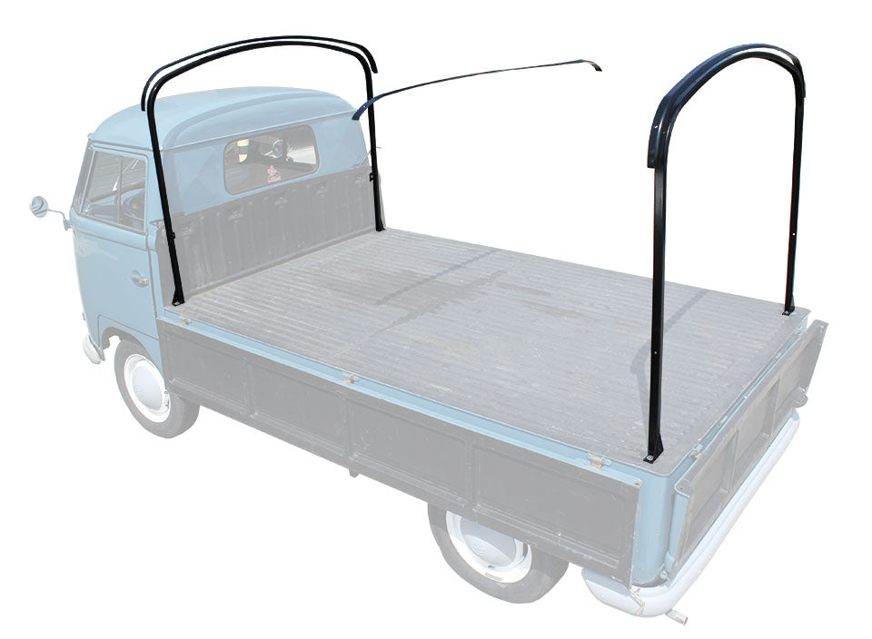 Pick-up hoop set A pick-up has a practical way to transport cargo with the disposal of a cargo bed. It s even more interesting when you can charge in all weather conditions. In the past Volkswagen has provided the material to cover the cargo bed by means of a tilt. MrFiat has now the mechanical part for this tilt at disposal so the construction can still be effectuated. The kit consists of the metallic construction parts only being a front and back hoop, 2 finish slats for the wooden front and rear slats, 1 center hoop to be used use on a single cab pick-up. These parts are all in black powder coating and fit on Splitbus as well as on Baywindow buses. for Bus Brasil, Bus T1, Bus T2A, Bus T2B models.
