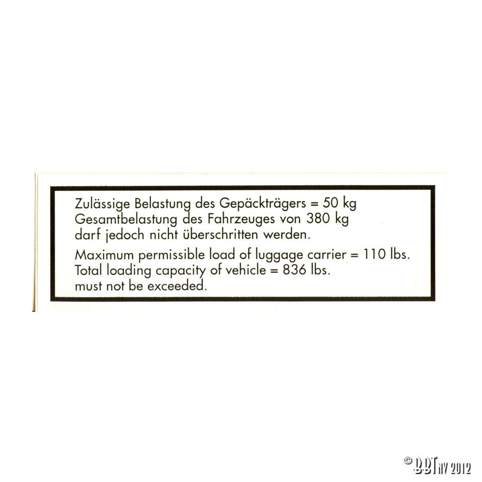 Sticker roofrack capacity for Beetle, Bus T1, Bus T25, Bus T25 Watercooled, Bus T2A, Bus T2B, Karmann Ghia 14, Type 3, Type 4 models.