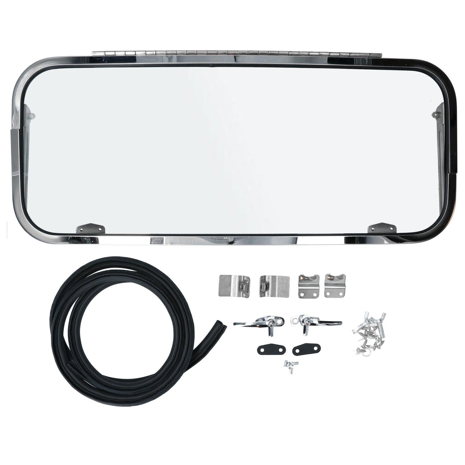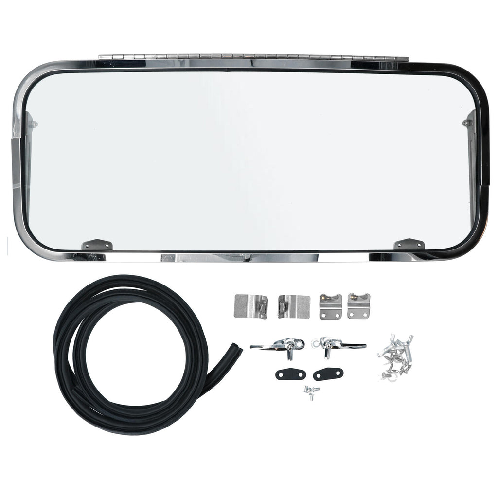 Safari window, rear RVS polished Complete kit with everything you need to replace your fixed rear window for a Safari window. Ideal for being able to open up to ventilate when spending the night in your van or for the nice cool breeze at the beach.Warning Do not drive safari with the rear window open due to exhaust fumes drawing in. for Bus Brasil, Bus T1 models.
