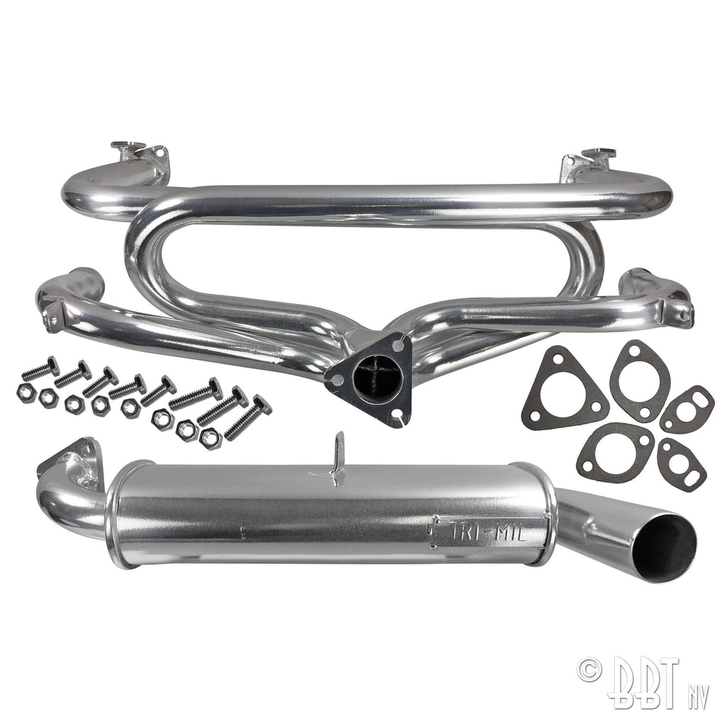 Header 4 in 1 S.Q.P. muffler Ceramic - Tri-Mil After Bugpack was sold to Empi we came to the end of our economic header system from Bugpack after going through all of our stocks. Tri-Mil is a long time in existence exhaust manufacturer and is very happy they have with MrFiat now a very strong distributor for the European market. for Beetle, Bus Brasil, Bus T1, Bus T2A, Bus T2B, Karmann Ghia 14, Type 181, Type 3 models.