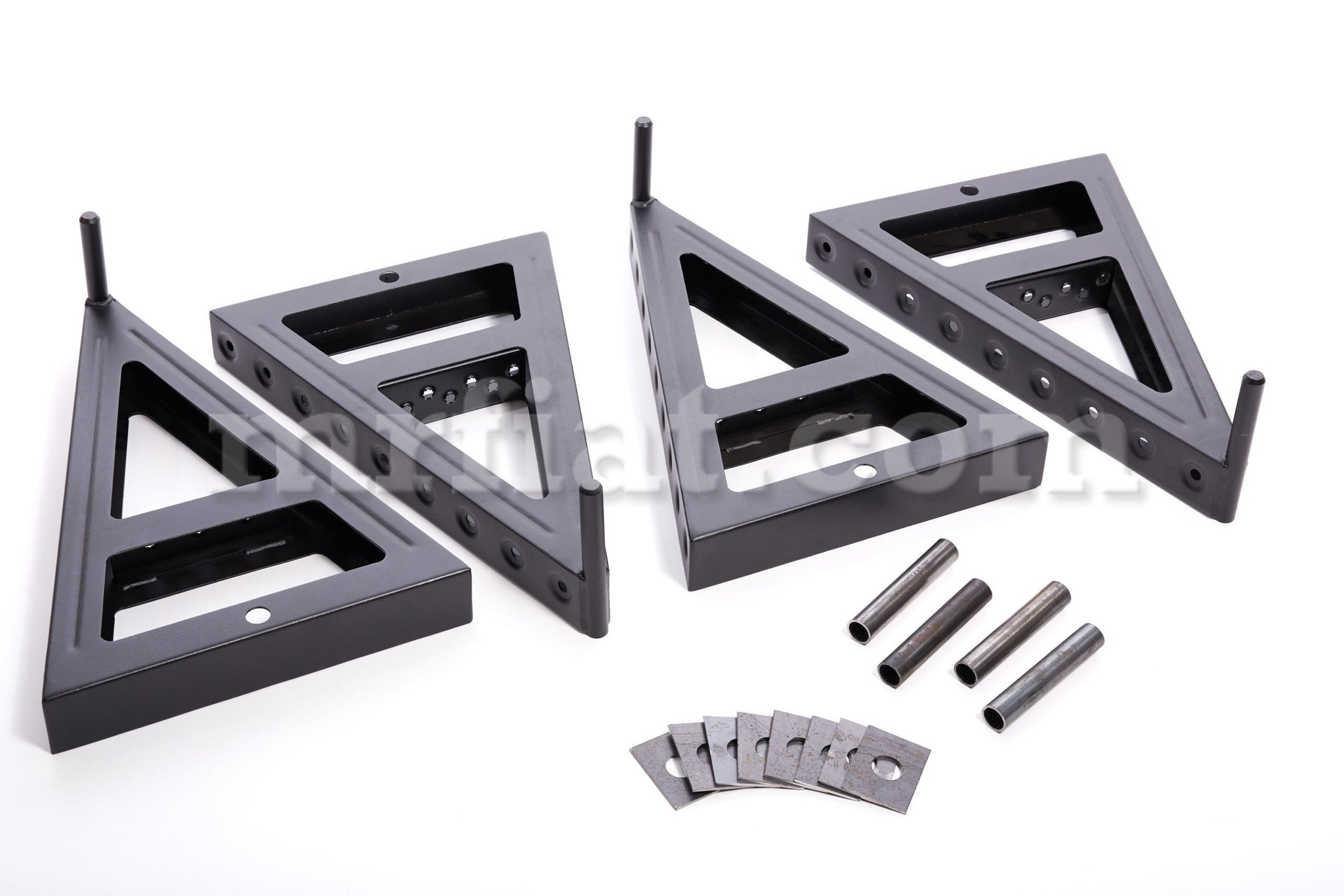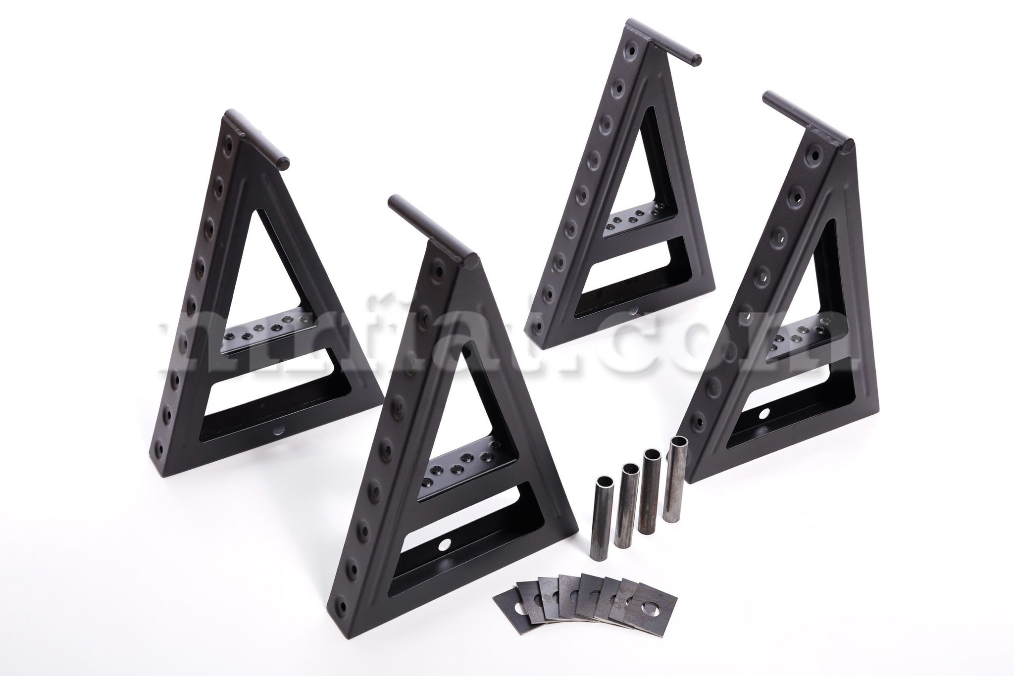 4 piece jack stand set for BMW E30 models. The set consists of 4 tubes that are welded to the body, then the jack stands can be easily pushed into the guides and ensure stability and safe working under the vehicle. In addition, the jack stands are equipped with a shelf for keys or accessories and a step, thanks to which work can be carried out under the car and in the upper part at the same time. They are made of S355 steel with 2mm thickness and black powder coated. The dimensions are: Pipe diameter: 21.3mm, Stand height: 570mm, and Stand width: 395mm. The weight of one jack stand is 4.66 kg. Quality product from Hamburg.
