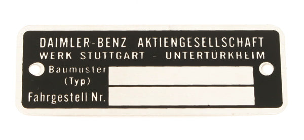 Chassis number plate for Mercedes 190 Ponton and 190 SL models. Measurements: 72 mm x 26 mm. Made in Italy.