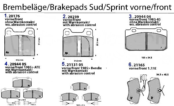 Front brake padsWithout Warning Unit for Alfa Romeo SUD SPRINT 1.2cc/1.3cc TI models. #4 in corresponding diagram.