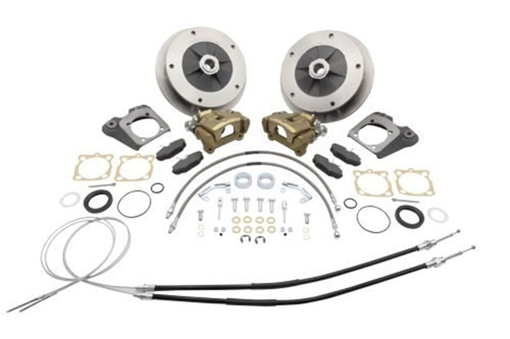 Beetle models 1967-72 rear disc brakes set. Comes with one piece brake rotors, calipers, brake pads, cast mounting brackets, upgraded stainless steel brake line, E- brake cables and all necessary hardware and gaskets. This must must use with 15'' Wheels. No need for adapters if you want to run wheels with the early VW 5x205 bolt pattern. The 1-piece design of these brake kits offers a bolt on kit to upgrade a street car to rear disc brakes, or give an Off-road play car the option to have a firm and responsive brake system without needless extra parts to get in the way.