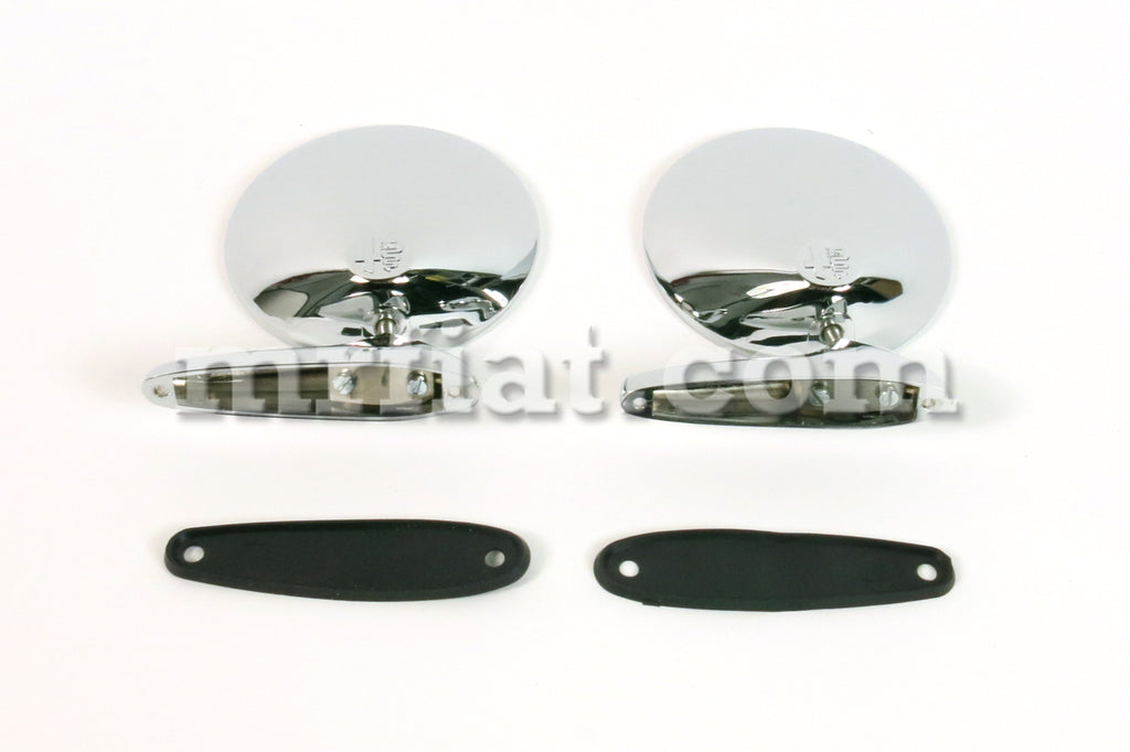 Set of chrome round side view mirrors with emblem for Alfa Romeo Spider models. The set includes 4 screws and 2 gaskets. OEM quality made in Italy. Works for left or right side with a narrow foot. The distance between mounting holes is: 95.00 mm or 3 5/8 inch approximately. Mirror measurement: 4 1/2 inch.