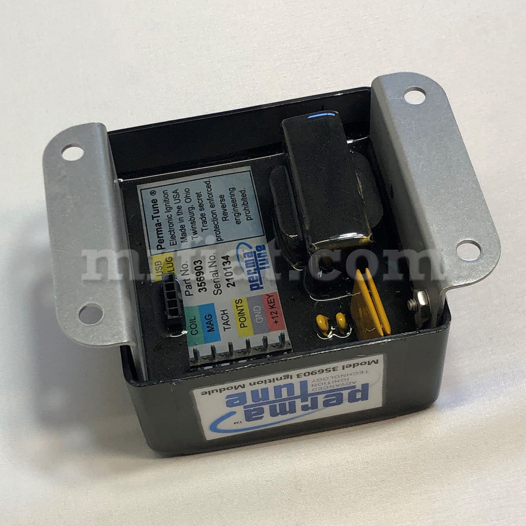 Perma-Tune ignition control module Porsche 914 models from 1970-75. The Model 356906 Perma-Tune is the sixth generation version of the original Perma-Tune ignition system co designed by Ferdinand Porsche and Theodore Sturm in the late 1960 s. The original Perma-Tune blue box was made in Newport Beach, California and was first used in Ferrari racing. The blue box became stock equipment on Porsche 911 cars built in the mid 1970 s. The Perma-Tune ignition module has remained in continuous production in the USA as an aftermarket performance part for vintage European for more than 50 years now. The Gen 6 Perma-Tune has the look of an old school Voltage regulator yet houses the latest ignition technology called Nanopulse Discharge Plasma Ignition.