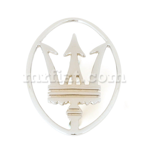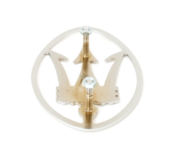 OEM tridente rear emblem for Maserati Quattroporte produced in 1995. This emblem is 70 mm wide and 99 mm tall with two threaded screws with nuts on the back vertically spaced 51 mm apart. Made in Italy