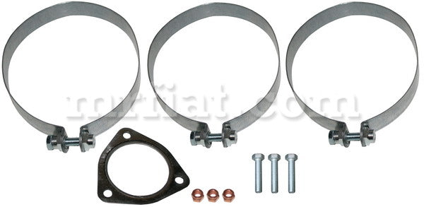 Exhaust muffler clamp kit Porsche 911 and 911/930models from 1978-89. The kit includes two clamps, gasket and hardware.
