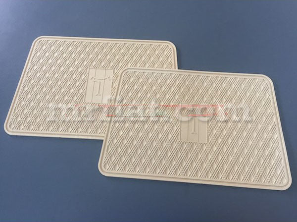 Beige heel tap rubber mats set for De Tomaso Deauville models. There is a 2-3 week production time for this item. Made in Italy. Original Equipment Manufactured Part. Part number: 14808-000B