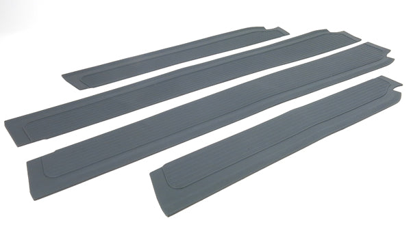 4 piece grey door sill rubber mat set for Mercedes W110, 190c, 190Dc, 200, 230, 200D models and W111, 220 Sedan, 220 S, 220 SE Coupe and Cabriolet, 230 S Sedan, 250 SE Coupe and Cabriolet, 280 SE Coupe and Cabriolet models. The longer mat measures 34 in x 4 in. The shorter mat measures 23 in x 3 3/8 in.