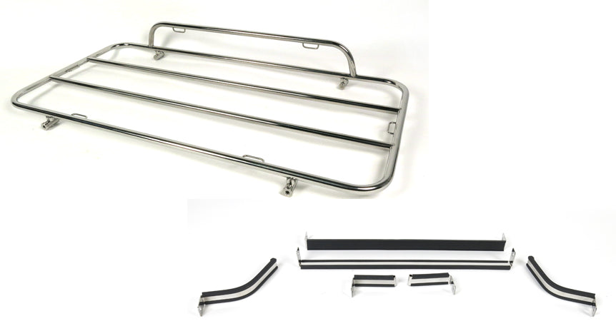 Luggage rack for Mercedes R107 SL models from 1972-1989.Made in Germany.Top quality, Stainless steel.Easy installation, it clamps on the front an back edges of the boot lid and has rubber feet to protect the paintwork.Fitting instructions with pictures.