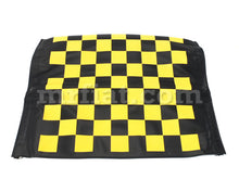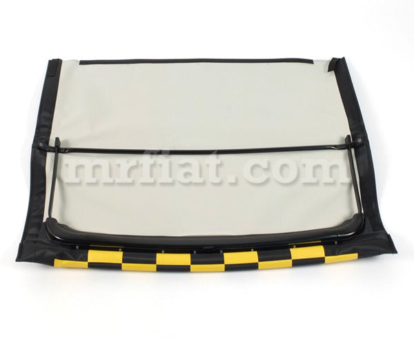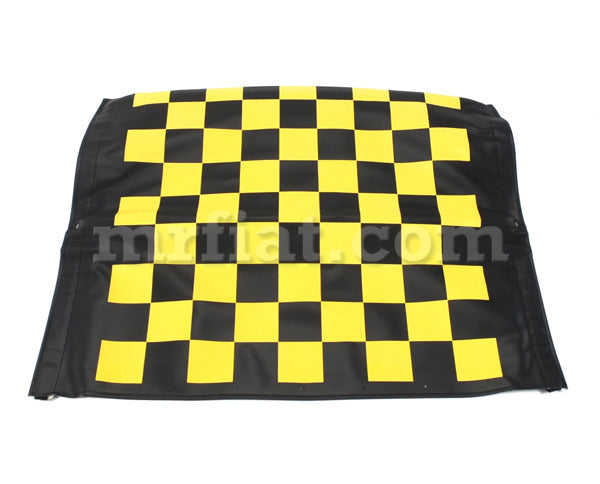 Yellow checkered complete folding top for Fiat 500 F, L and R models from 1965-75. This contains a fully assembled main frame, center rail,and fabric.