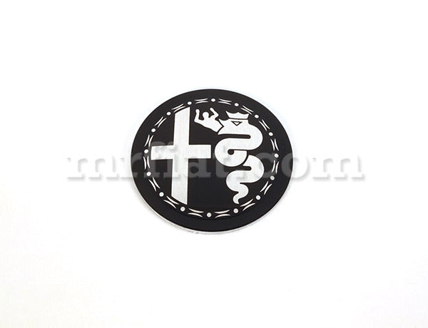 Black-silver wheel cap emblem, 48 mm diameter for Alfa Romeo GiuliettaChassis 116models. Made with original OEM tooling in Italy.