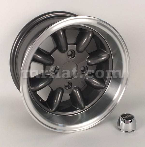 Anthracite polished 7x13 Minilite style wheel for Sunbeam Alpine, Tiger, and Lotus models. Bolt Pattern: 4 x 108 ET -7. Weighs 6.1 kg. Made in Germany.