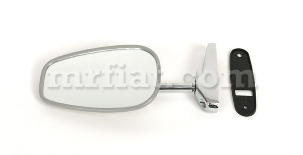 Side view embossed trapezoidal mirror for Alfa Romeo Alfetta Berlina models. The distance between mounting holes is: 92.00 mm or 3 5/8approximately. Made with original OEM tooling in Italy.