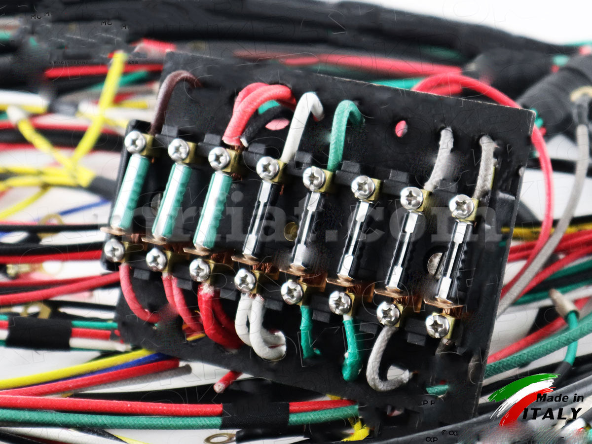 Electrical wire kit for Alfa Romeo 750 D/F Giulietta Spider with Borg-Warner gearbox. These handmade cable looms are identical to the originals in material, design, and color. Including breaker box, fuses, plugs, and wiring diagram. Please ask for your specific harness to fit your classic car. Made in Italy.
