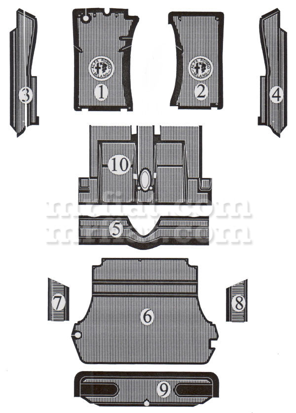 Right side trunk rubber mat #8 for all Alfa Romeo Spider models from 1970 - 82. There is a 2-3 week production time for this item. Made in Italy. Original Equipment Manufactured Part. Part number: 10070-008