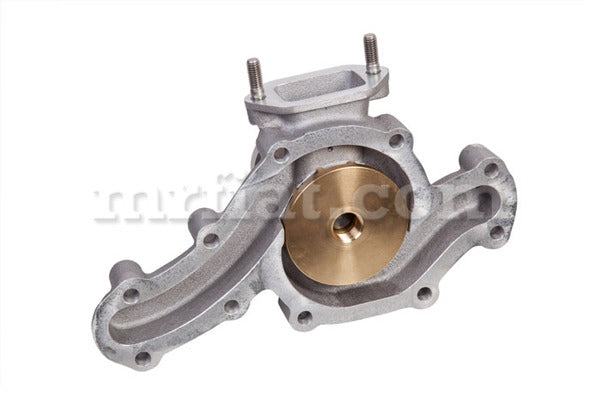 Complete water pump assembly for Ferrari Dino 206 and 246 GT GTS L and M Series models. This early B version water pump model is made out of cast brass and has a long water channel. Body length: 260 mm. Fits the oval mouth of the front plate. Cavity optimized wing geometry of the impeller, using latest technology, thus significantly improving its durability. Made in Germany.
