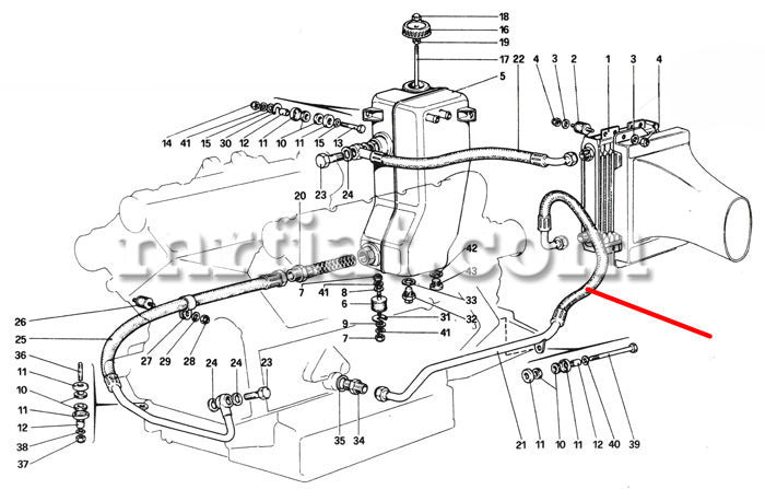 Oil pressure engine cooler hose for Ferrari 208 and 308 GTB models with dry sump lubrication.