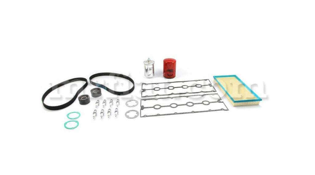 Complete engine service kit version 2 for Ferrari 328 models. It includes: all gaskets, filters, sparks, timing belts and timing belt tensioner bearing.