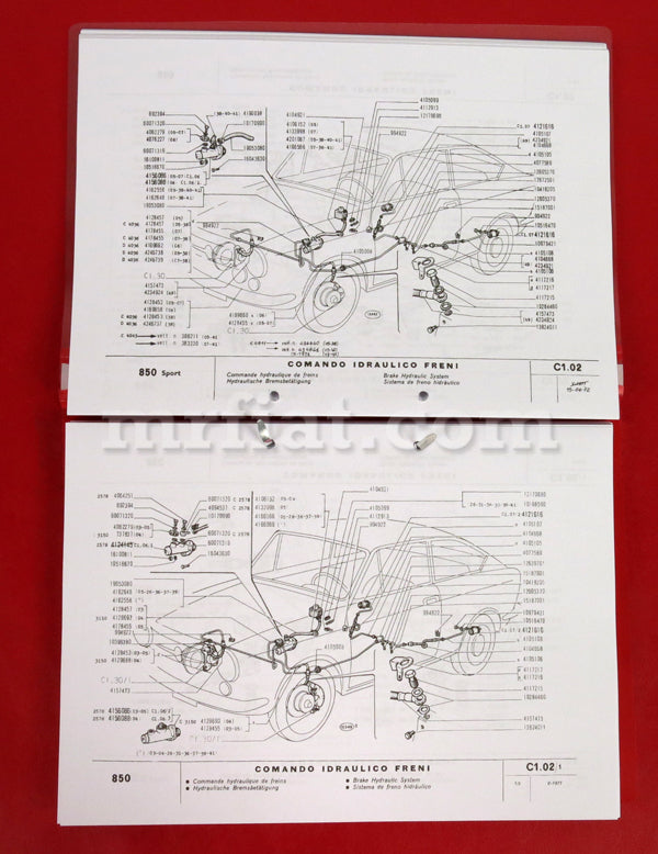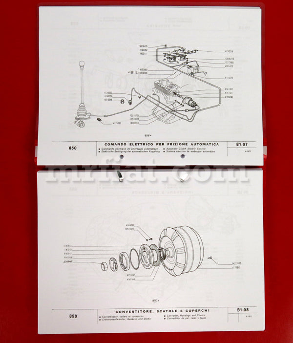 Mechanical spare parts catalog for Fiat 850 models. It is a copy of the original Italian catalog with original factory numbers. It contains 308 pages.