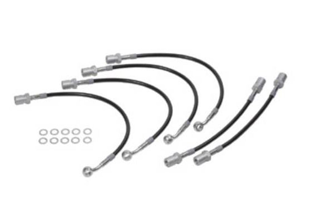 Steelflex brake hose set for Fiat Dino 2400 models. It contains: 6 brake hoses. 4 front and 2 rear. Once installed, you will never have to change them again because of tears or expansion.They come with MOT certification. The hoses are made out of DuPont Teflon. They are first braided with stainless steel and then a transparent coat protects them from brake dust. They fit perfectly the metal brake pipes connections.