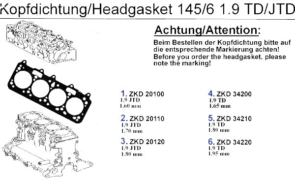 Thickness: 1.70 mm 1 notch head gasket for Alfa Romeo 145/6 1.9cc JTD models. #2 in corresponding diagram.