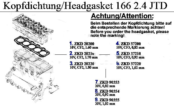 Head gasketThickness: 1.60 Mm 0 Notches for Alfa Romeo 166 2.4cc JTD models. #1 in corresponding diagram.
